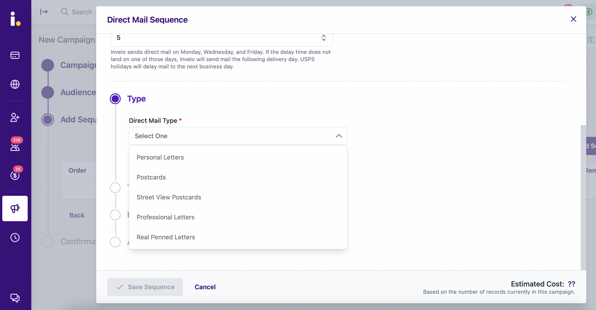 Invelo has five types of direct mail available for users: postcards, personal letters, street view postcards, professional letters, and real-penned letters.