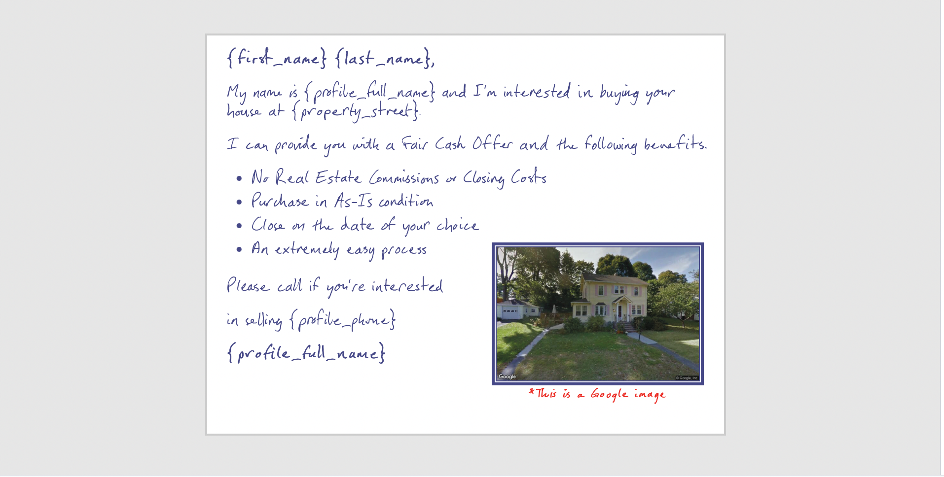 The final direct mail offering is the popular real penned letters. These letters are created using a real ballpoint pen to give them the appearance that they are completely handwritten. Letters that look like they were written by hand will stand out among other marketing materials sent in the mail and are more likely to get read. Choose from Cash Offer and Follow-Up letter templates and customize the content and attributes. Each letter is sent with the text written in a blue ballpoint pen.