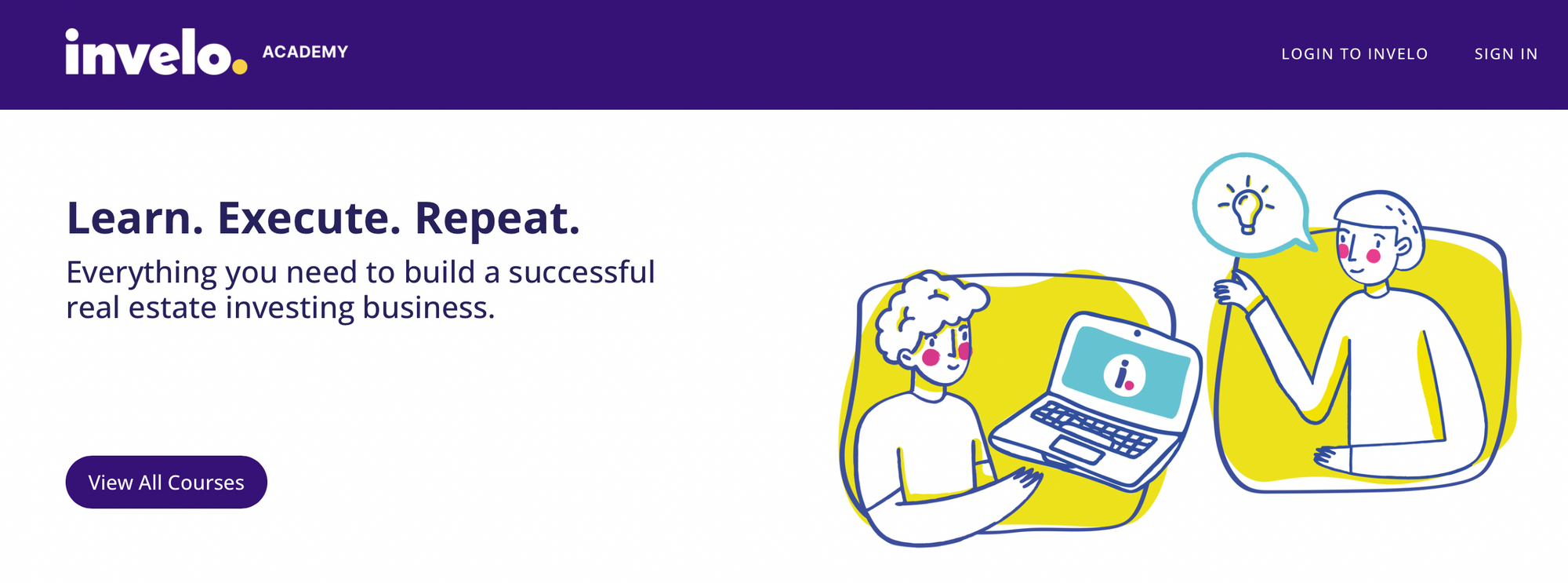 Aside from providing real estate investors with tools like the list builder, sales pipeline management, marketing and more, Invelo is also dedicated to helping investors grow their business through education. Users at all subscription levels, even free, can access Invelo’s comprehensive REI training courses designed to help investors streamline their process and make the most out of their investments.