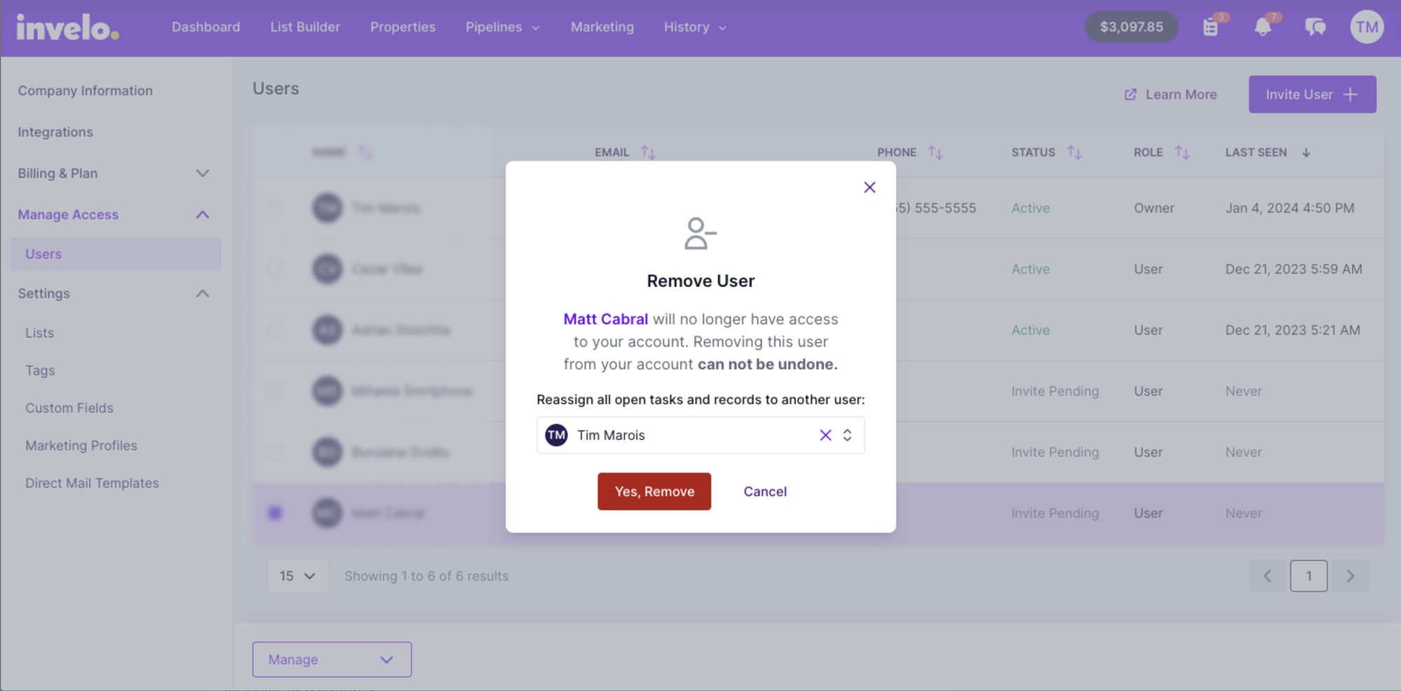 One of the key areas we focused on is team management. Understanding the need for fluid team dynamics, we've made it simpler to manage your users and control their access. A standout feature is the ability to reassign all tasks and property records seamlessly if you remove a team member. This update ensures that team transitions are smoother and more efficient than ever.
