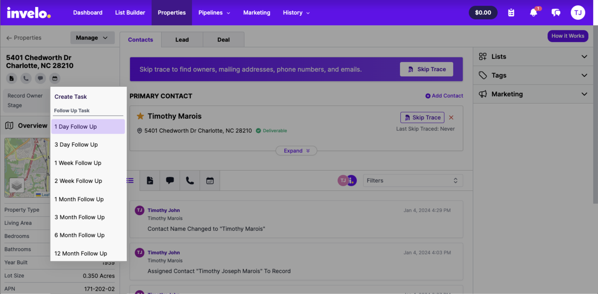 - Quick Follow-Up Tasks: Set follow-up tasks on property records with automatic due date creation.