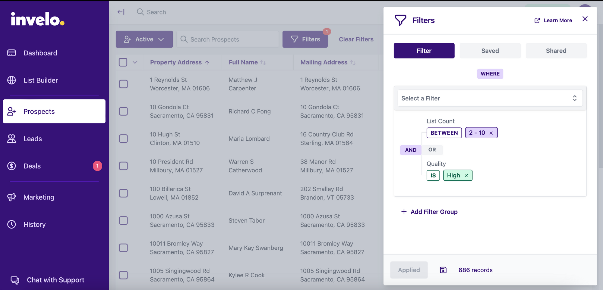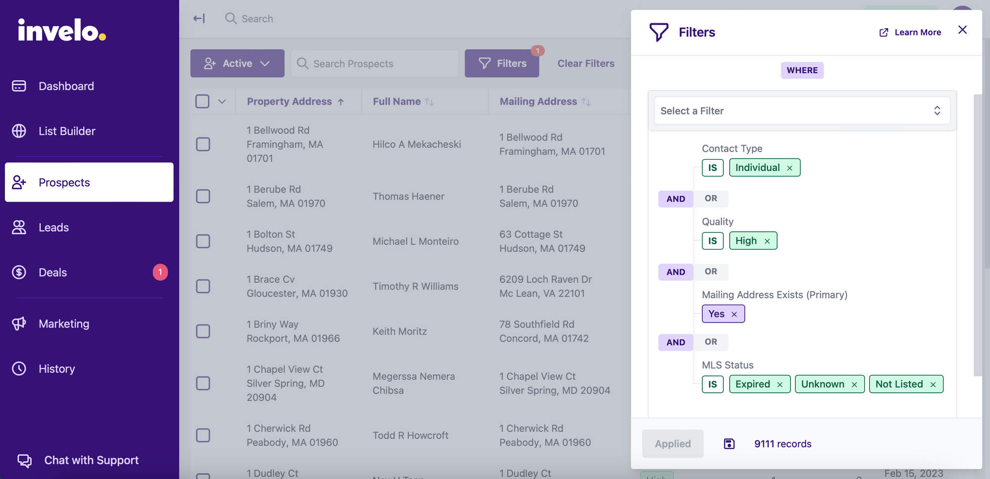 Before you can craft a more personalized message, you need to be able to segment your prospects to find property owners and homes with similar and desirable attributes. To find those prospects, you want to utilize the ‘Filters’ in the Prospects tab on the Invelo platform. Within stage filters, you can select all the attributes you want (or don’t want) to find records that meet your criteria.