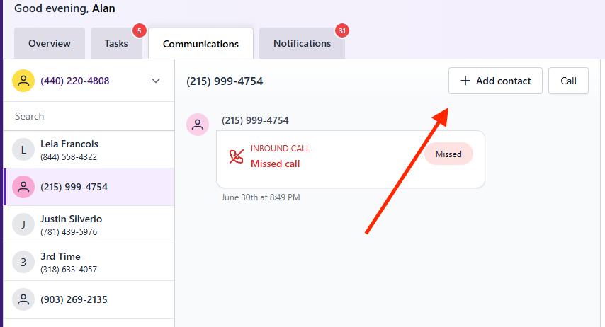 Create a contact directly from unknown inbound messages or missed calls—without switching views.