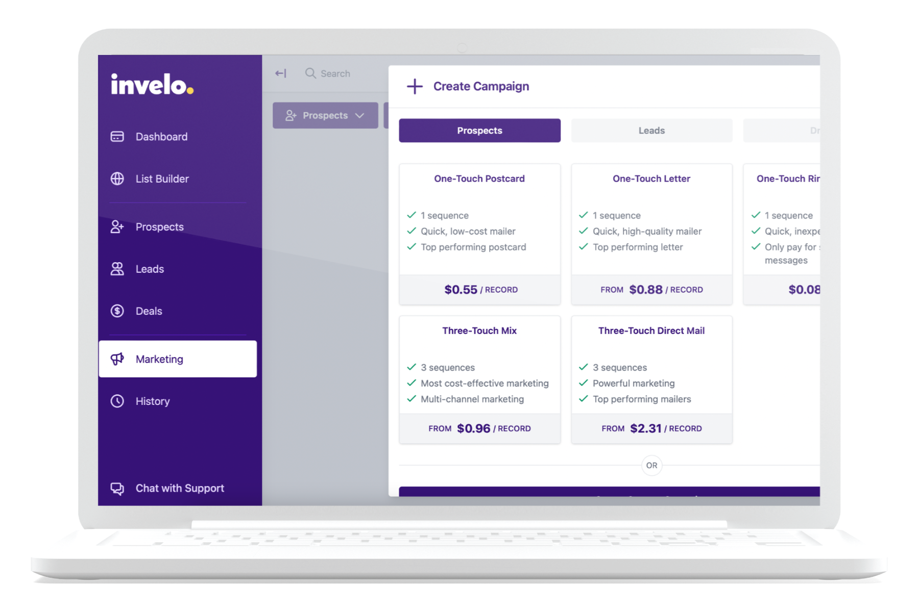 That is why Invelo is perfect for any real estate investor that wants to create powerful, multi-touch marketing campaigns on the same platform they use to build lists and manage their sales pipeline. You will always be one click away from your marketing campaigns every time you are on the platform ensuring that they are always being managed and looked after.