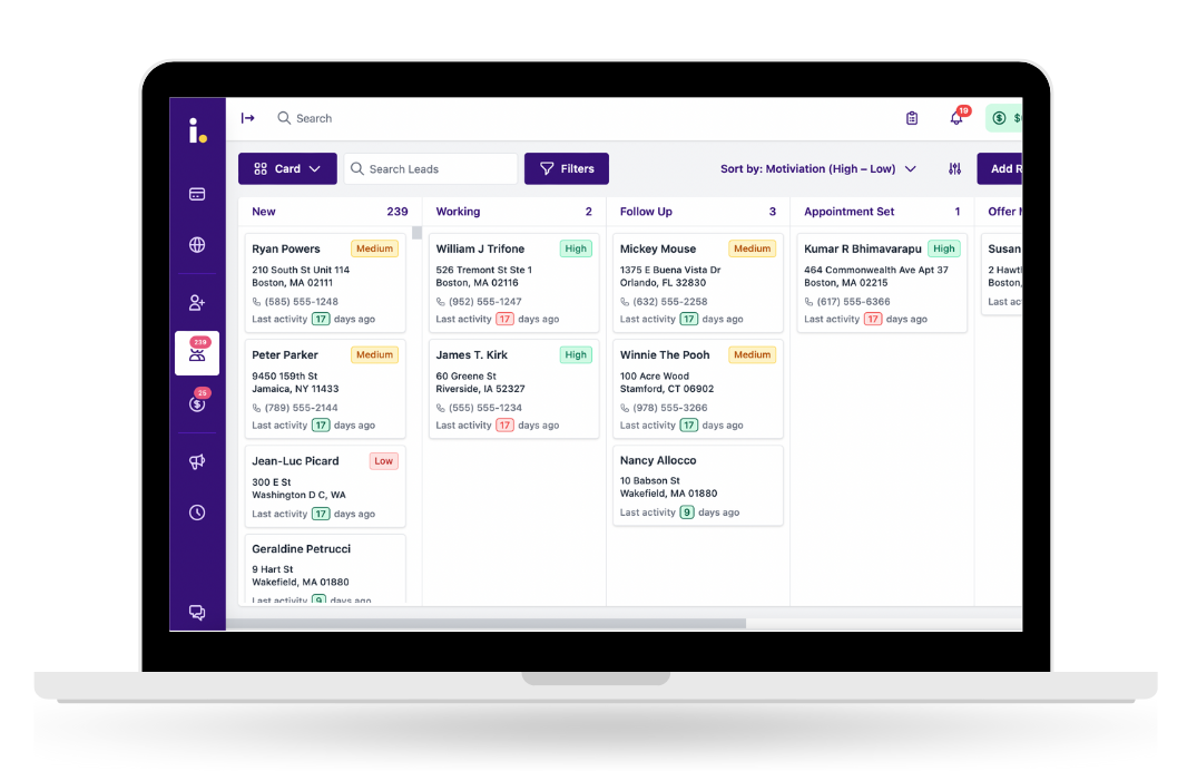 Managing records can be time-consuming and tedious if you use a basic CRM or, even worse, a spreadsheet. Invelo includes a fully built-out real estate CRM that allows you to track all of your prospects from the moment they enter your database until the moment they convert to a deal.