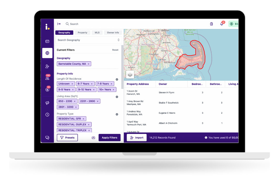 Invelo’s List Builder was created to make searching simple. The function includes several pre-set lists that only require geographic information. These lists are a shortcut to creating some of the most common prospect lists, including absentee owners, small houses, high-equity homes, and more.