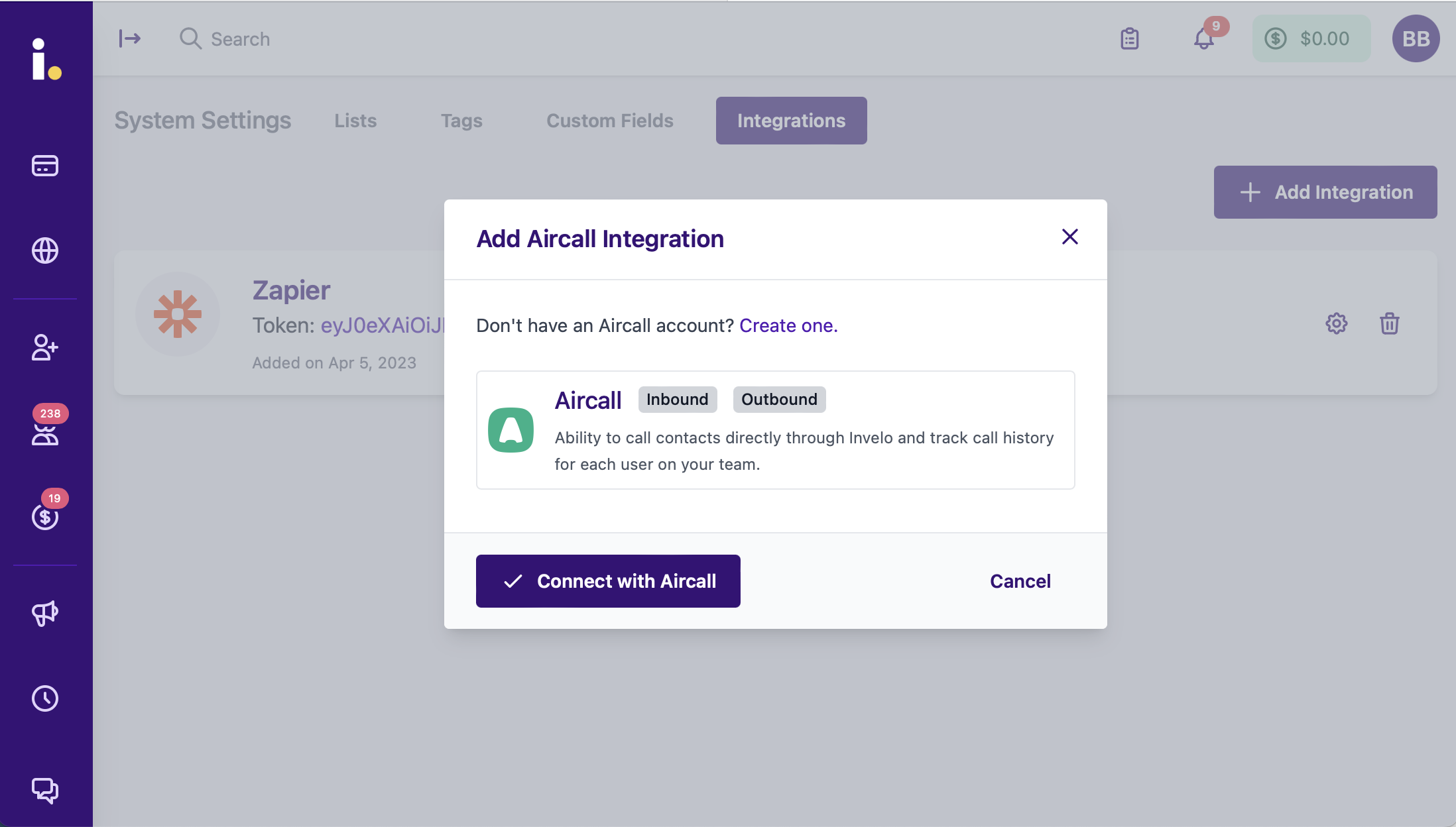 To start using Aircall, you must change your default calling platform. Start by going to your account settings in the top right corner of the screen. Next, click on the icon and choose “System Settings, “Integrations,” and “Add Integration.” Next, select Aircall at the top of the right-hand pop-out, then click “Connect With Aircall.”