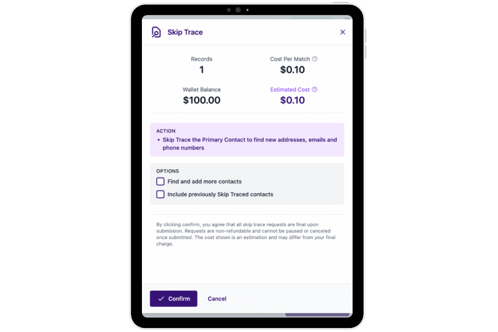 You don’t need to sign up for a million different services to build your real estate investment business or find new leads. You can do everything right in Invelo – including skip trace! Skip trace within the platform for a small fee per contact and only pay if a 100% match is found.
