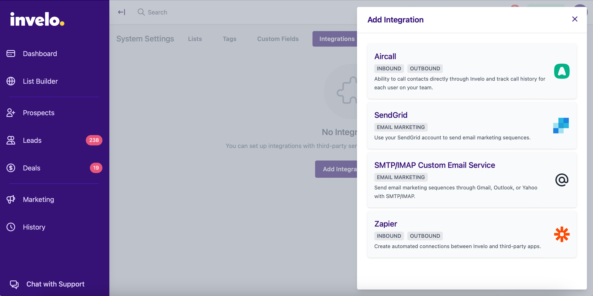 The Zapier integration with Invelo is now available for all users on an Individual or Professional subscription plan. Users at those levels can access the integration by going to "System Settings" and selecting "Integrations." Once on the screen select "Add Integration" from the button on the top righthand side. Select Zapier and follow the instructions to connect your accounts. Make sure you are logged into Zapier before you get started!